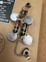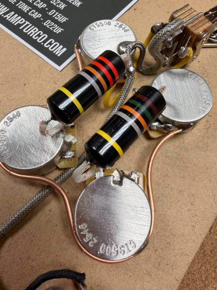 I am welcoming the Woodrite Revelator to the harness lineup. These are incredible guitars and can be taken to the next level with an Ampturco Guitar Werks harness. You can take the stock pickups to another level with my Custom Overspec CTS Potentiometers with an excellent smooth and gradual taper all done in 50’s wiring style layout for the best overall volume and tone control. The custom CTS potentiometers are all measured for their exact values before hand selecting where they will go in the circuit. I will use the higher valued pots usually 540k to 550k for the neck pickup and the lower values 510k-530k for the bridge pickup. The over spec values allow the pickups to perform at thier peak, allowing more overall frequencies to make it to output / your amplifier. Stock potentiometers are usually measured in at below 500k sometimes making the pickups sound dull and muddy. The neck pickup is paired up with a .015uf Centralab Bumlebee Oil Capacitor and the bridge pickup is paired with a .022uf Centralab Bumblbee Oil Capacitor. These two values give the best tone roll off for each pickup position. The harness is fitted with a Centralab 3 way angled Toggle Switch and a Switchcraft output jack. For all Woodrite guitars the stock hole size for the potentiometers will need to be slightly enlarged to accept the 3/8” threaded shaft found on the CTS potentiometers. This is an easy non evasive modification that any competent technician could do. If you have any questions please feel free to message me on any of the social media platforms before ordering. These are built as ordered one at a time so please allow for about 4 weeks for turnaround. ΔGW
